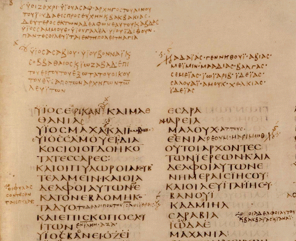 detail of top corner of Codex Sinaiticus quire 36 folio 4 recto with original text in calligraphic uncial (black letters) & scribal corrections & comments (faded red ink) in the margins [image courtesy of CodexSinaiticus.org]